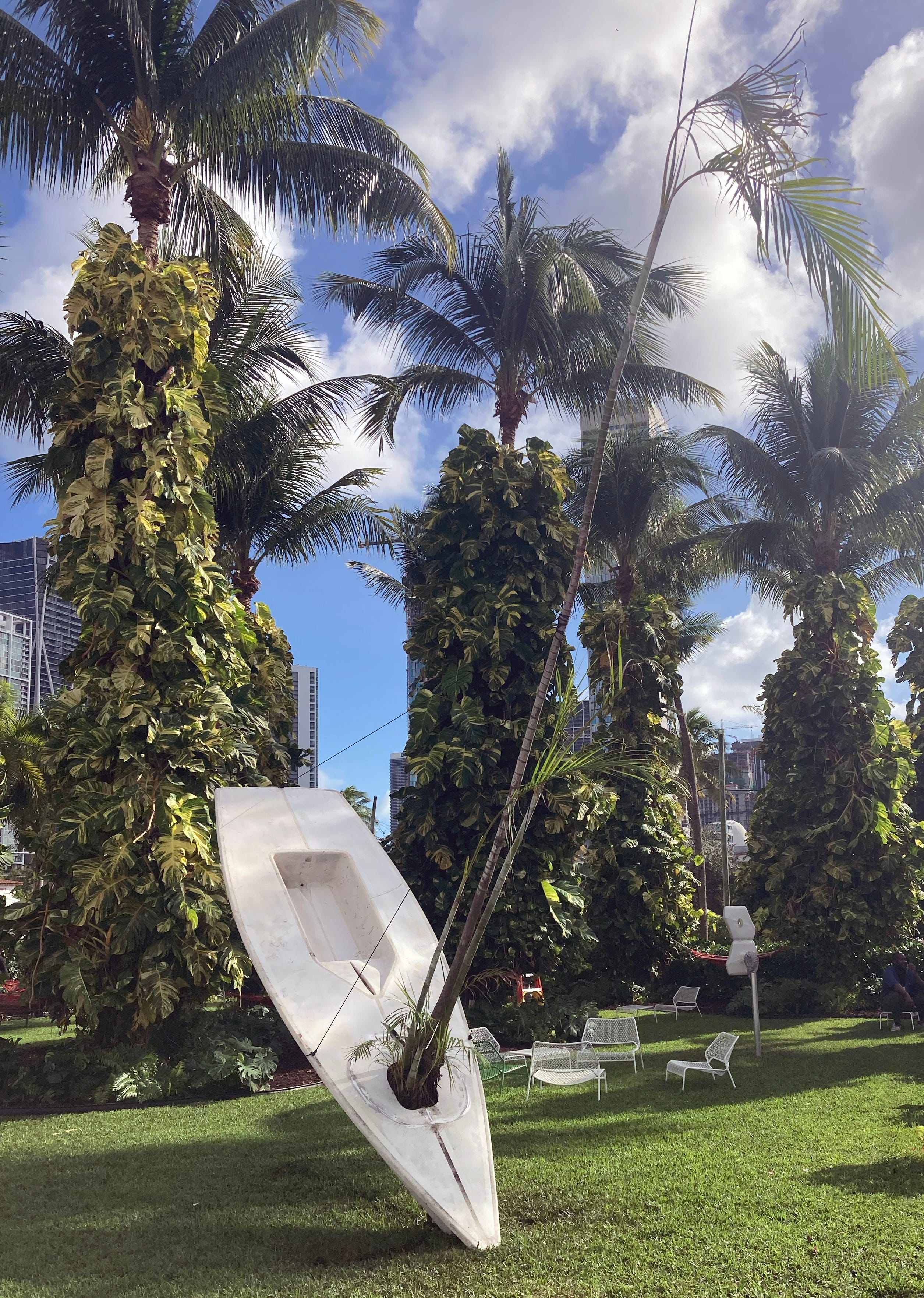 The shipwrecked sculpture, presented by Baker—Hall at NADA Miami, is the latest in a flotilla of boat-related art works and art-adjacent boat experiences I’ve been lucky enough to have with the artist.